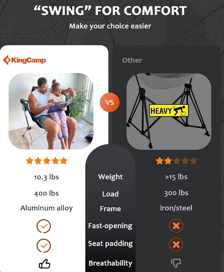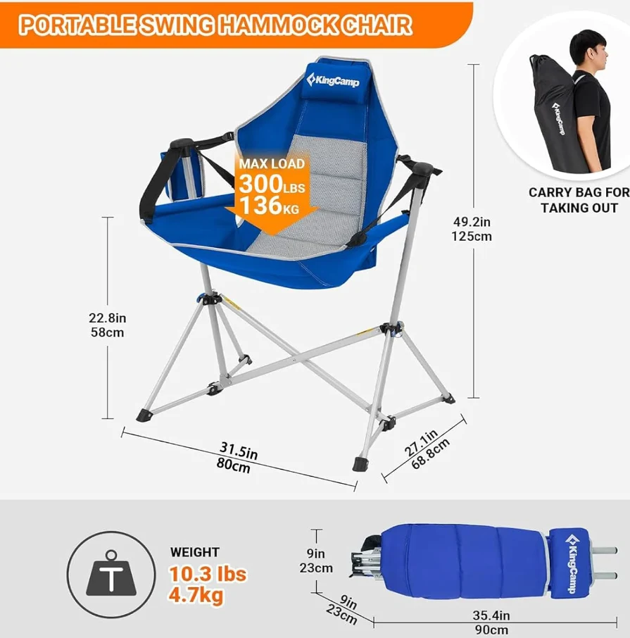 A kültéri kempingszék 37,8 "x27.1" x49.2 ", tágas ülésterülete van, hogy korlátlanul kóboroljon, és a magas háttámla teljes mértékben támogathatja a hátát. 22,8" A földön kívül a hintaszék tökéletes a felnőttek nyújtásához. a lábak szabadon.