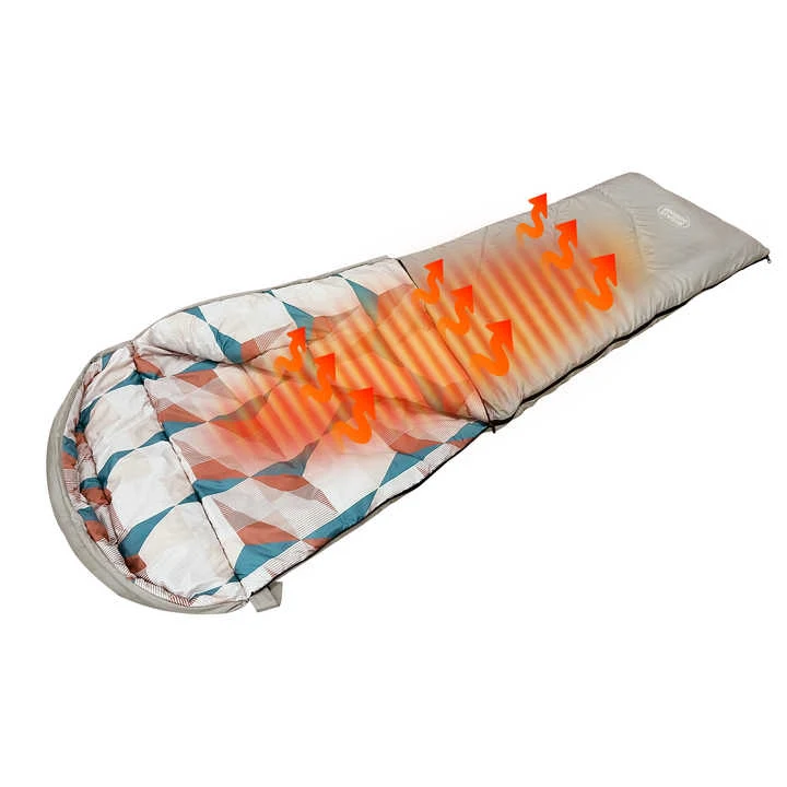 Felnőtt vízálló téli kempingzsák. megvastagodott vállfürdővel és húzózsinórral, amely melegíti a fejét és a nyakát.