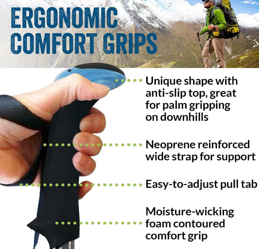 Kettős fogantyú, összecsukható trekking pólus, beállítható 2 darabos hajtogató túrázás / gyalogos / túrázó oszlopok levegője, amelyek mindössze 13,5 hüvelykre esnek össze, és mindegyiknél kevesebb, mint 11 uncia. A tökéletes ajándék az utazási szerető számára. Válassza ki azokat a oszlopokat, amelyek megfelelnek a magasságának és a választott markolatoknak.
