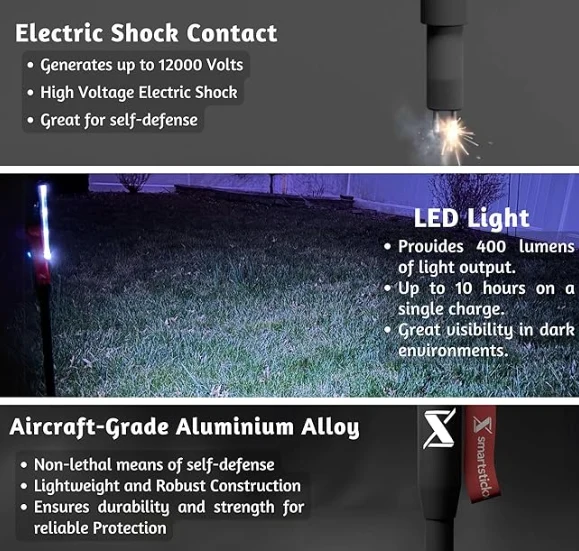 Két mód kapható a LED-en: egy fényes fehér fény, amely tökéletes kempinghez és piros/kék vaku vészhelyzetekhez, így hatékony eszköz az éjszakai botok önvédelemhez.