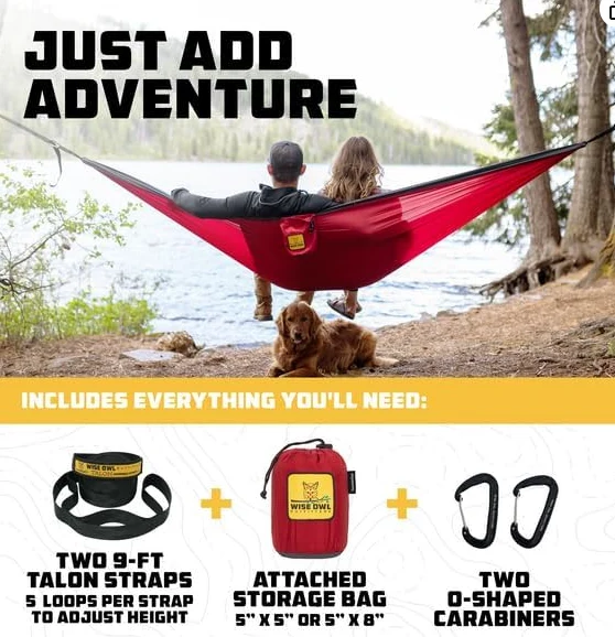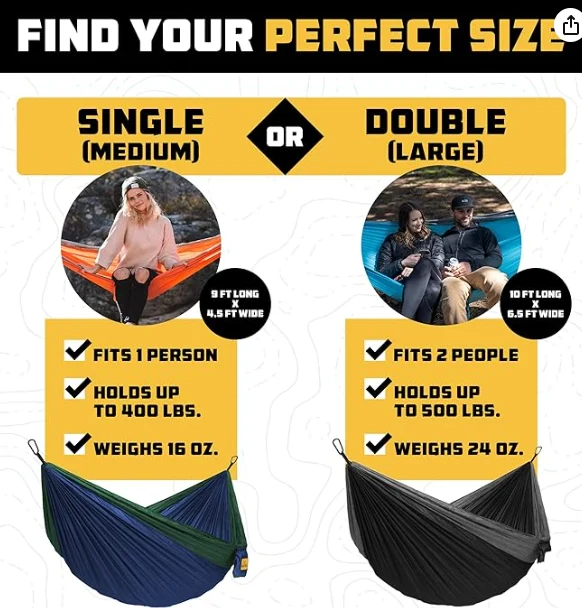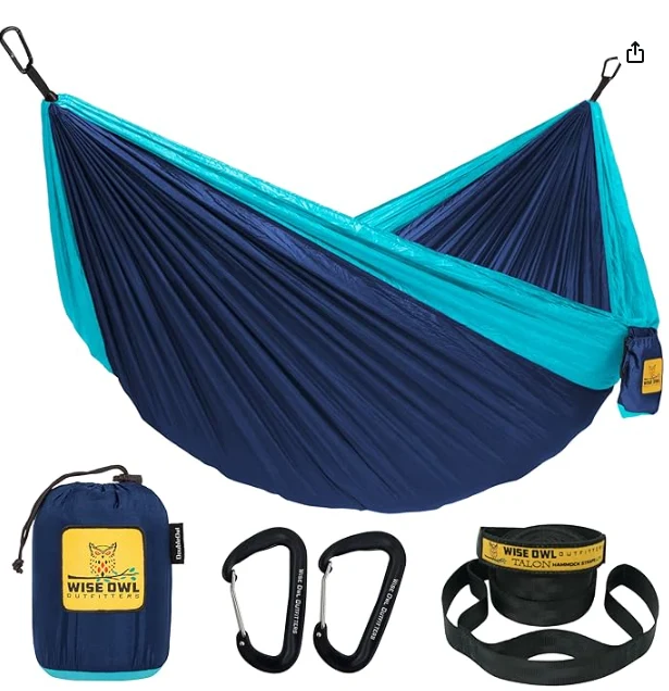 Hordozható 3-in-1 kemping függőágy. Könnyű függőágyaink különféle színes kombinációkban vannak, hogy összehangolják a felszerelést, valamint két méretet az Ön igényeinek megfelelően. Az egyetlen bagoly kényelmesen ül egy embert, és akár 400 fontot is képes tartani. A dupla bagoly akár 500 fontot is képes tartani, és tökéletes a kettőhöz. Ha kibontakozva, a táska zsebként duplázza a telefonját, italát vagy más tárgyait. Nem nagyobb, mint egy padlizsán, ha kompakt, ez a függőágy tökéletes a szabadtéri kalandok megteremtéséhez.