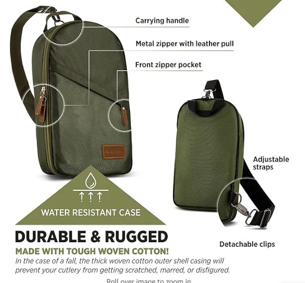 Hordozható kültéri kemping szerszámtáska. Több rekesszel rendelkezik, tehát a sweware erős marad, és a szállítás során nem csapódik be. Esés esetén a vastag szövött pamut külső héj háza megakadályozza, hogy az evőeszközök karcolódjanak, megrázkódjanak vagy eltorzuljanak. Összehajtva a tasak kényelmesen illeszkedik az utazási poggyászhoz, a csomagtartóhoz, vagy kézi tartható (beépített fogantyú). A mosogatógép biztonságos és könnyen megtisztul, és mosóbarát. Karcsú kialakítású tervezéssel könnyedén tárolható a standard tárolókban