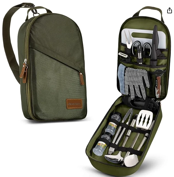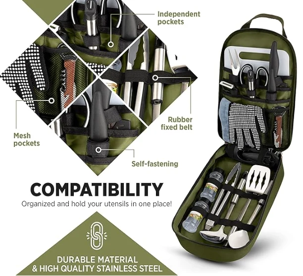 Hordozható kültéri kempingszerszámtáskában, minden edénynek megvan a saját kijelölt tasakja, így az egységek nem kennek, nem kapnak meg vagy megsérülnek a tárolásban vagy az átutazás során. Könnyű hozzáférést biztosít a főzőedényekhez, és biztonságos cipzáras pecséttel van felszerelve