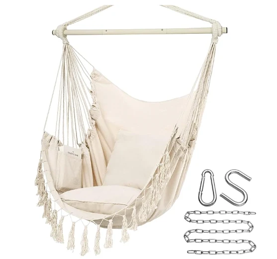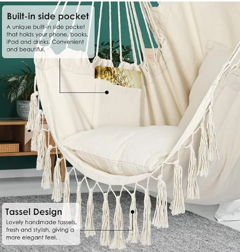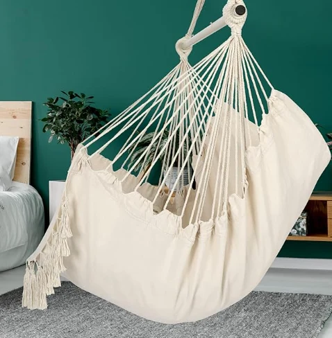 Varró ejtőernyős függőágyat. Csak keressen egy ág, gerenda vagy függőágy keretet, nagyszerű hintaszék kívül vagy belül. Nagyon alkalmas a hálószobákban, szoba dekorációként, erkéllyel, udvarként és kertként. Ha visszatérésre van szüksége, ne távolítsa el a címkét a lengőszékről