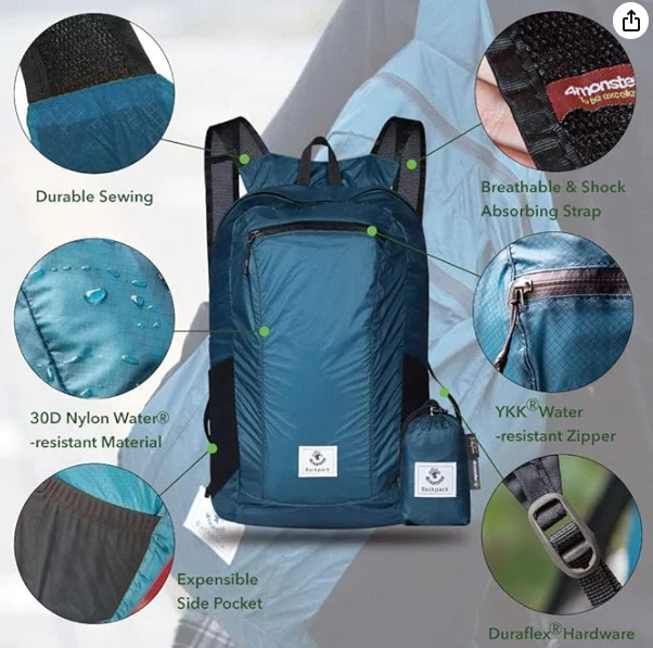 Vízálló, könnyű túrázó hátizsák, ez a könnyű túrázási nappali csomag vízálló anyagból és cipzárból készül. Hatékonyan megakadályozza az esővíz nedvesítését a telefon vagy a készpénz és más tárgyak a hátizsákban.